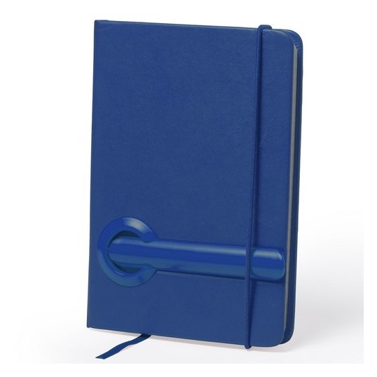 – Bloc de notas con tapas rígidas de suave tacto acabadas en polipiel de vivos colores y con bolígrafo a juego integrado en portada. Con 80 hojas de distribución a una raya, elástico de sujeción y marcapáginas de tela a juego.Polipiel
